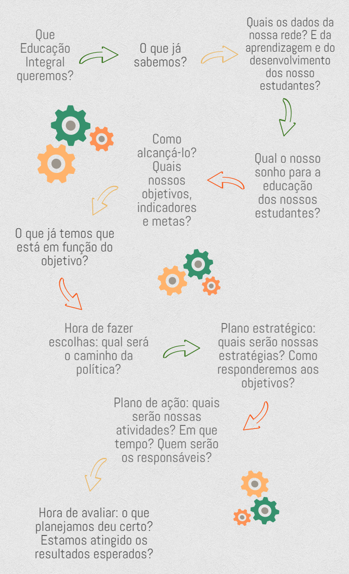Uma política de Educação Integral se traduz em dois documentos/frentes complementares: um plano estratégico para a Educação Integral no município ou estado, que deve conter os princípios orientadores, diagnóstico da situação de aprendizagem e de desenvolvimento dos estudantes da rede e as diretrizes, objetivos, indicadores e metas gerais da proposta e um plano de ação que responda a esse direcionamento, com estratégias, atividades, responsáveis, cronograma e orçamento. O processo de construção dos documentos devem sempre que possível partir de equipes de diferentes setores do governo, objetivando que a própria estruturação da política tenha início e sustentação em mecanismos intersetoriais.