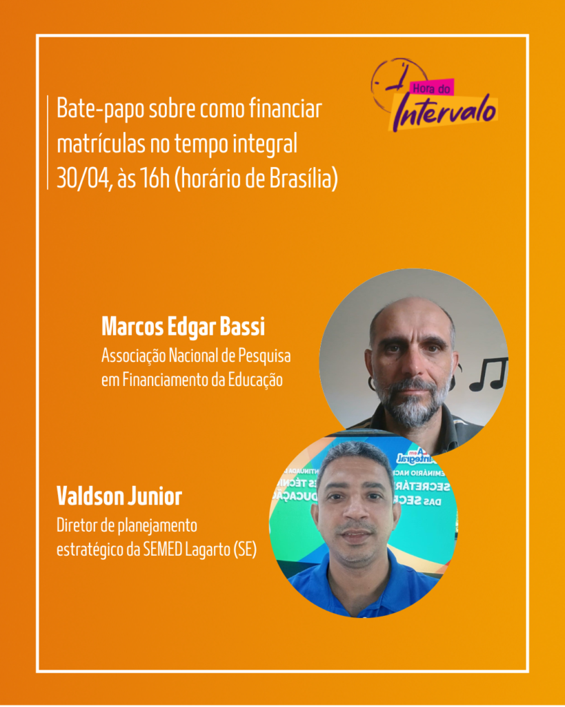 Resumo: A Hora do Intervalo deste mês vai trazer orientações e dicas práticas sobre como financiar matrículas de tempo integral com recursos do Fundeb. Participe mandando suas dúvidas! Esta edição acontece pelo canal no YouTube do Centro de Referências em Educação Integral.